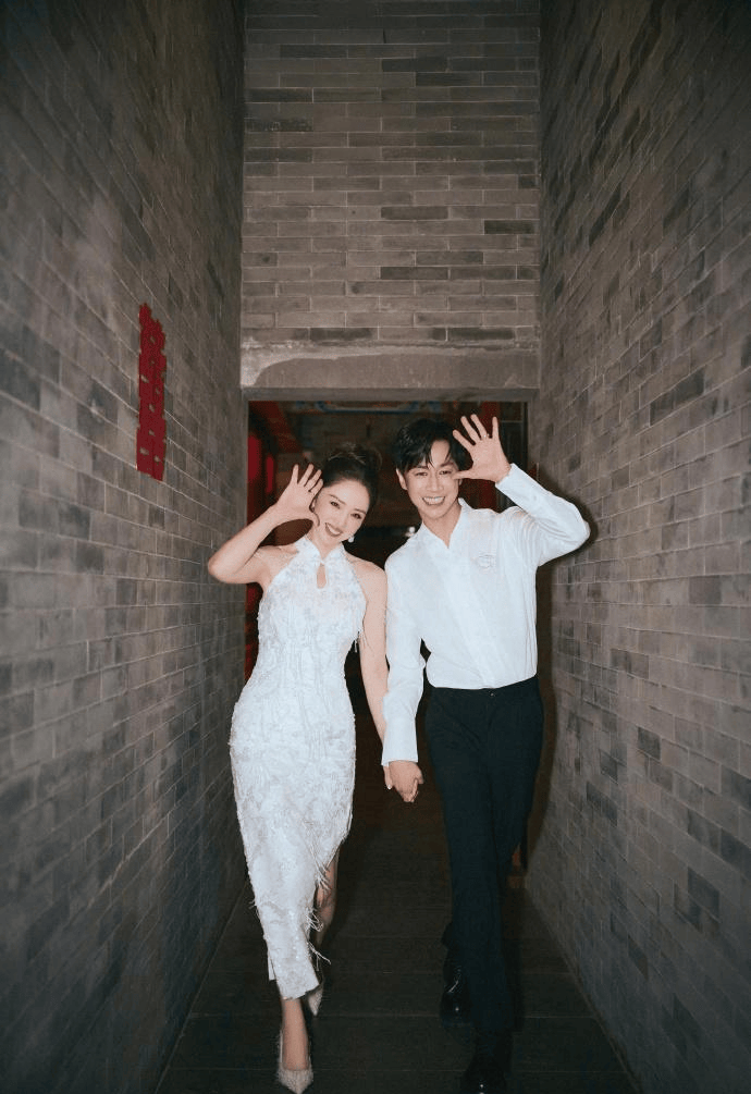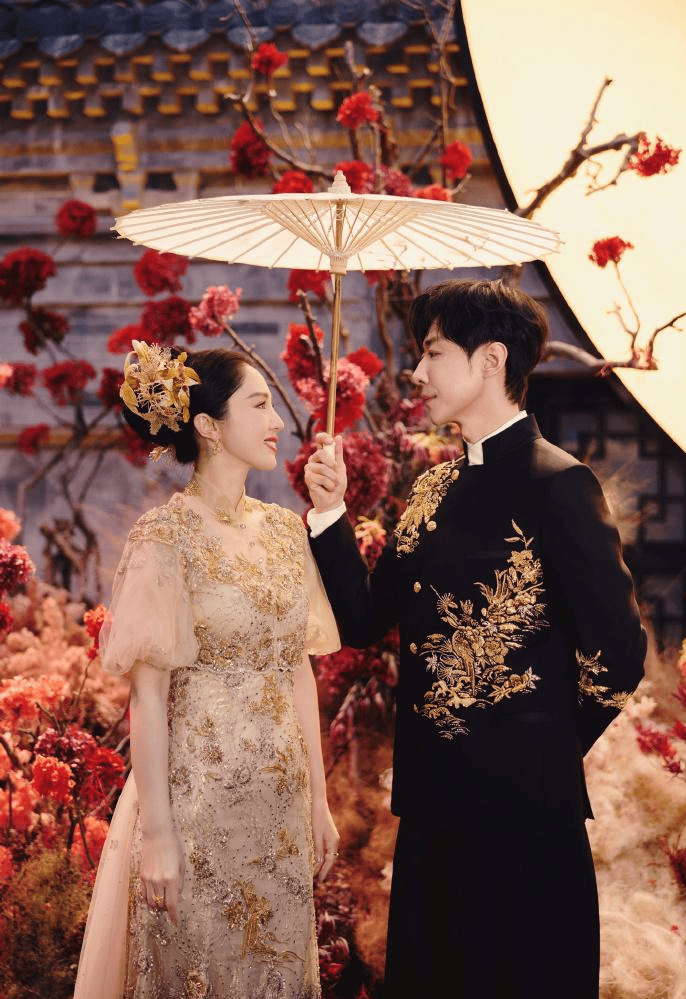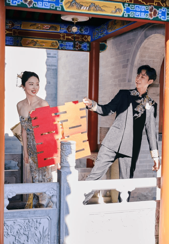 董璇在婚礼上更换了多套礼服,包括纯白蕾丝迎宾纱、镶钻珍珠旗袍及大红中式抹胸晨袍,手持双喜团扇,尽显东方美学的典雅韵味。其中一套金色礼服格外引人注目,戴着金饰,像凤冠霞帔,摇曳生姿,仪态端庄,被网友称赞有“贵妃即视感”。张维伊则穿着深色长袍,打扮精神利索,与董璇站在一起十分登对。两人还特意拍摄了一组国风结婚照,以古典窗棂、红金屏风、竹影灯笼为背景,融合传统元素与现代摄影手法,营造出诗意氛围。