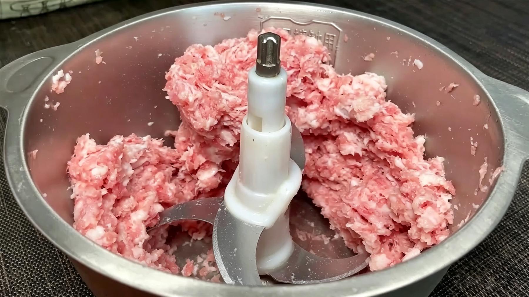 2️⃣准备肉馅:选一块肥瘦相间的五花肉(三肥七瘦口感最好),先切成厚片,再切成小丁,放入料理机中打成肉馅(自己打的肉馅别打太细,保留一点颗粒感,蒸出来更有嚼头)。