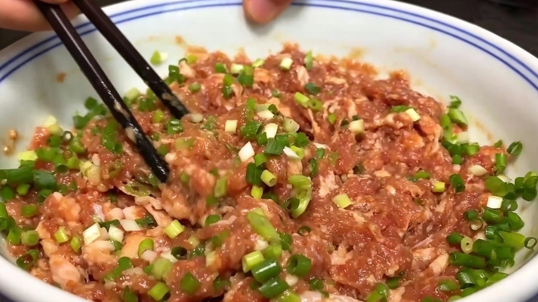 4️⃣加入葱花:准备三四根小葱,洗净切成细碎的葱花,放入肉馅中,再次搅拌均匀。此时肉馅已经香气扑鼻,放一旁备用。