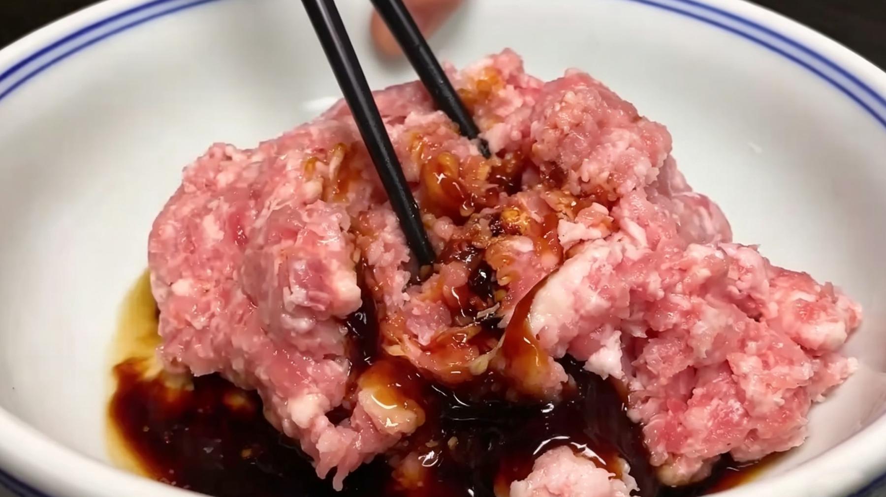 3️⃣ 给肉馅调味:把打好的肉馅放进碗里,加入盐、鸡精、白糖、生抽、老抽、蚝油、料酒(具体用量根据个人口味,老抽主要为了上色,少放一点就行)。用筷子朝一个方向充分搅拌,直到肉馅发黏、上劲,如果觉得肉馅偏干,可以少量打一点葱姜水进去,更嫩。