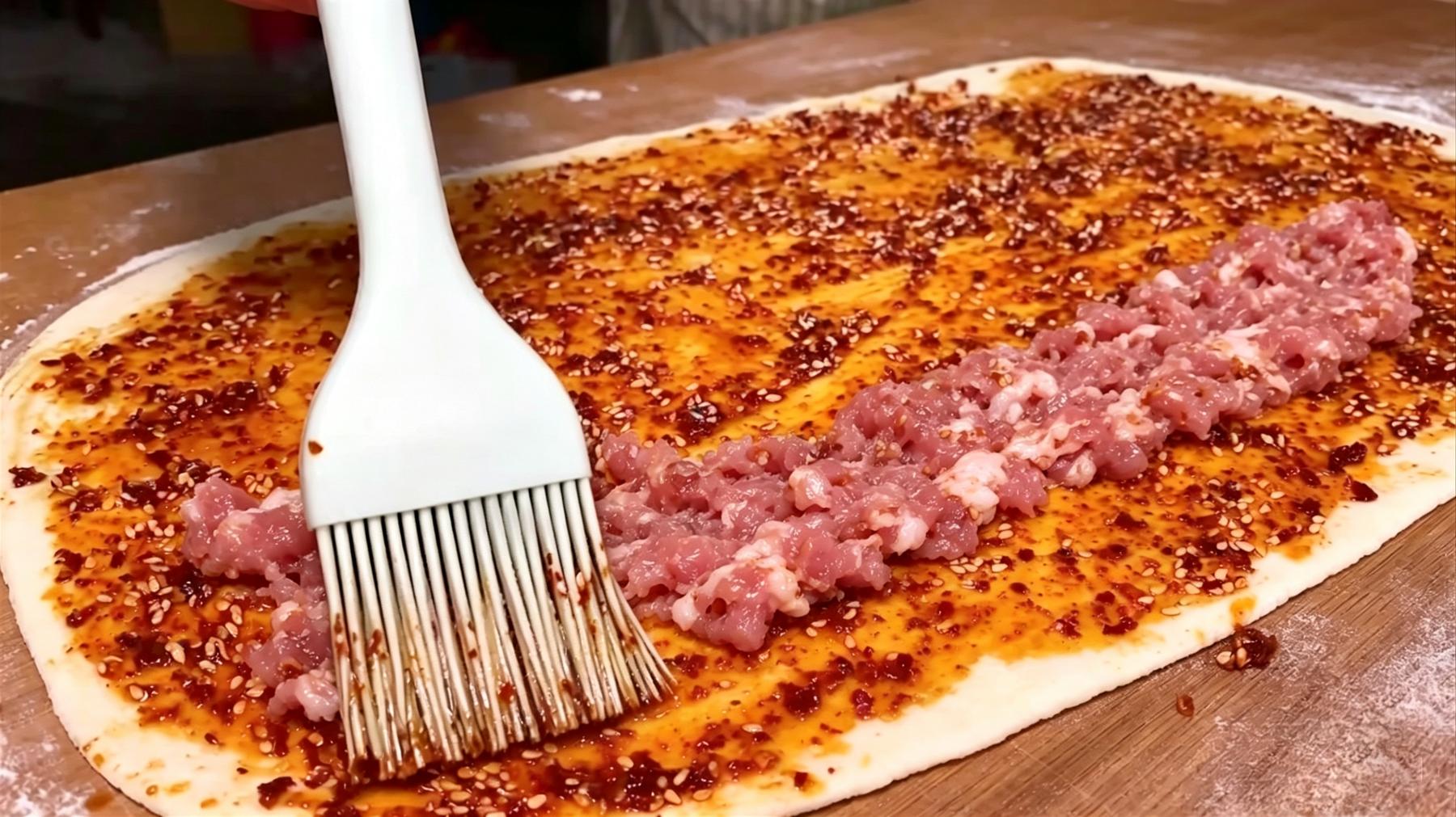 7️⃣铺料并卷起:先用刷子把调好的香辣油均匀刷在整个面饼表面(喜欢吃辣的可以多刷一些)。