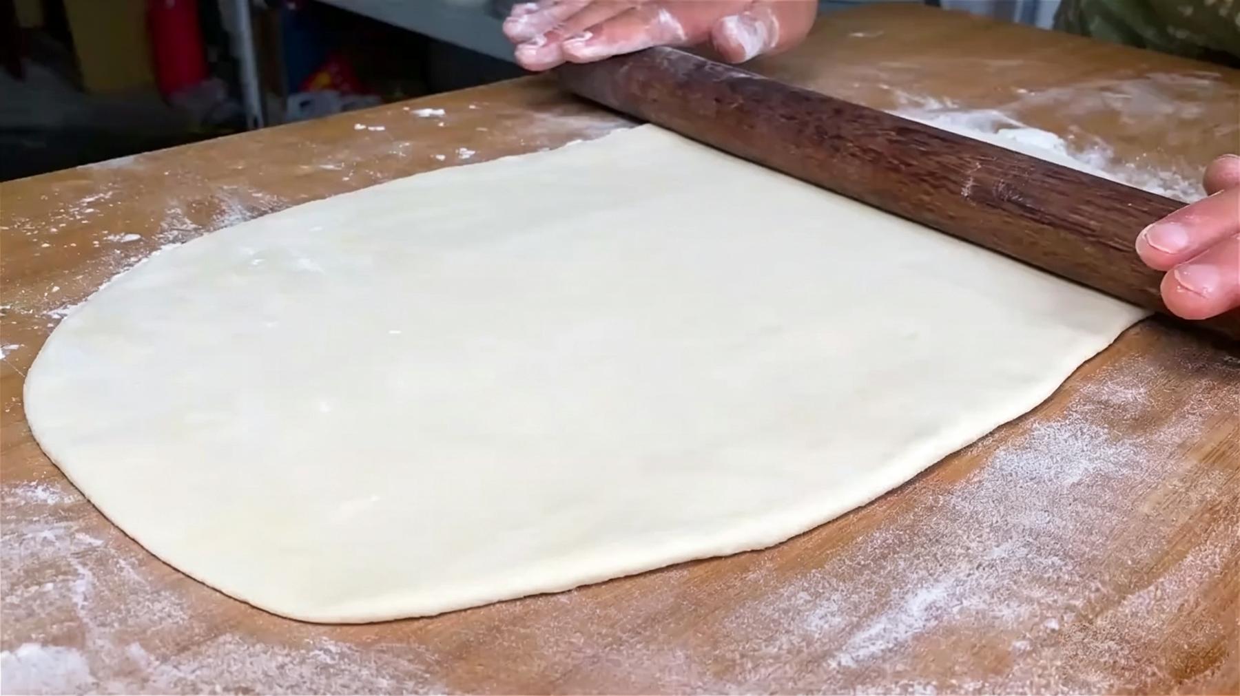 6️⃣擀面饼:把醒好的面团取出来,搁在撒了干面粉的案板上。先像揉面球似的把面团搓一搓,把里面的气都排出来,感觉面团变得瓷实些就行。然后拿起擀面杖,从面团中间开始,慢慢往四周擀。一边擀一边转面团,就跟玩似的。这薄饼的厚度差不多 3 毫米,比饺子皮稍微厚那么一丢丢;