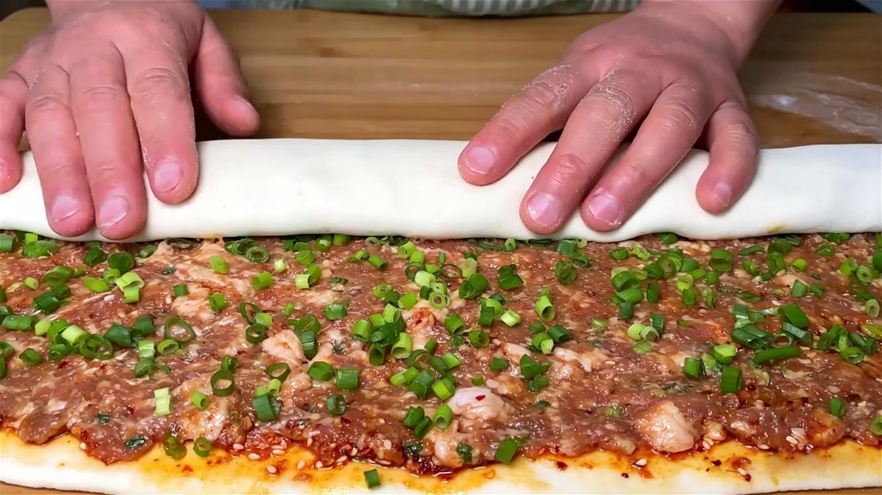 然后把调好的肉馅均匀铺上去,注意不要铺太厚,边缘留出一指宽的空隙。最后撒上剩余的葱花。从长边的一侧慢慢将面饼卷起来,卷得紧实一些,收口处捏紧朝下放。