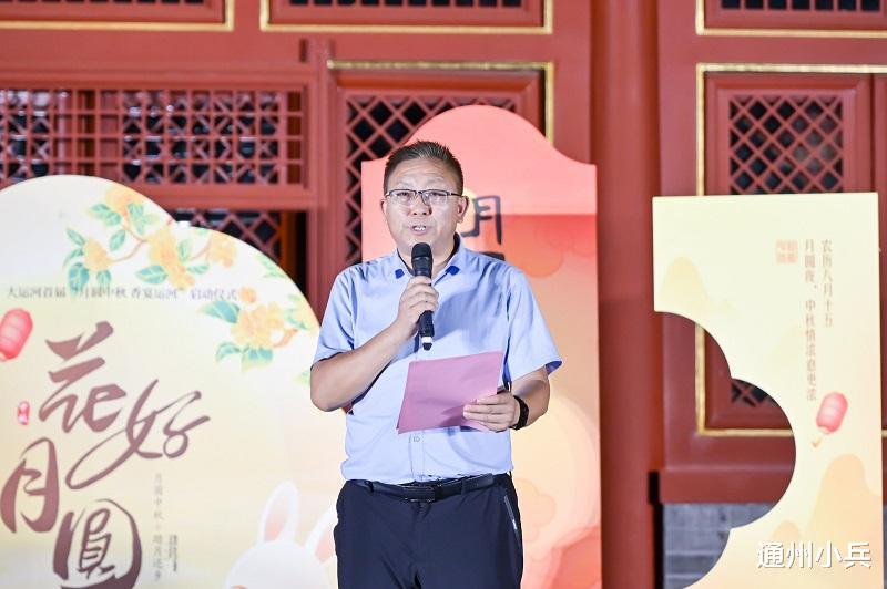 北京通州文化旅游协会秘书长、北京城市副中心旅游行业团工委副书记杜山川代表大运河文旅公司总经理兼通州文旅协会会长栾笑天为本次活动致辞。据杜山川介绍,通州文旅协会大力支持会员企业开发文化场景和空间打造,大运河文旅公司也在景区创建铸牢中华民族共同体意识基地,本次活动的举办,是积极响应中共北京市通州区委、统战部关于“把优秀传统文化展示好,形成好的传播效应”“通过中华优秀传统文化铸牢中华民族共同体意识”的指示精神,在通州区委统战部、区文旅局指导下,组织会员企业在大运河旅游景区开展铸牢中华民族共同体意识的活动内容之一,未来将以不同形式常态化在景区演绎,今天的香宴运河文化游园体验与文艺汇演活动,也将是以非遗匠心点亮团圆之夜,塑造“北京城市副中心美好生活”文化新空间的一种尝试,将进一步促进中华优秀传统文化的广泛传播,构筑中华民族共有精神家园。欢迎更多的文化旅游企业入住副中心发展,打造文化旅游新场景、新空间,通过更多的文化体验活动,去传承中国大运河文化的源远流长,去领略活力通州的新时代文化乐章!杜山川还借用北京通州文化旅游协会首席专家夏国雄老师的一首藏头诗,向与会嘉宾致以了中秋佳节最真挚的祝福:祝福句句暖,您喜我也欢;中天一轮满,秋月印万川;快意香宴起,乐赏运河月。