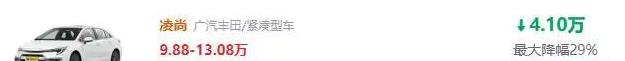 当前在售的丰田凌尚,官方指导价为13.98万至15.88万,最大优惠力度为29%,最低裸车价格为9.5万。