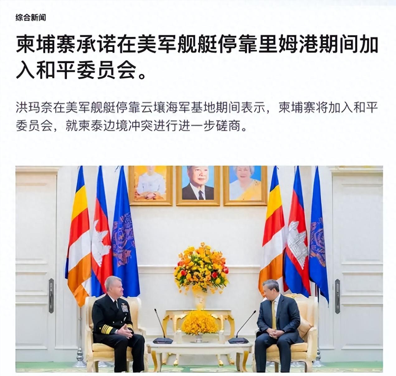 报道称,在美军“辛辛那提”号军舰首次停靠云壤军港期间,柬埔寨首相当面和美军印太司令提到加入和平委员会,“展现了柬埔寨对全球和平的善意和高度遵守承诺”。