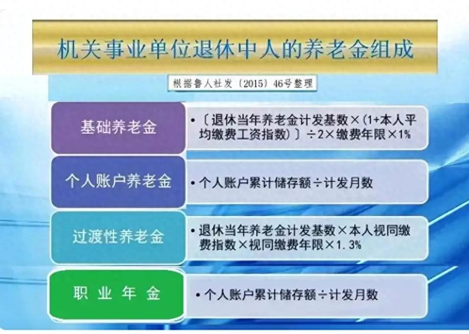 过渡期结束后,机关事业单位退休人员的养老金将完全按照与企业职工相同的公式计算,由以下三部分组成:
