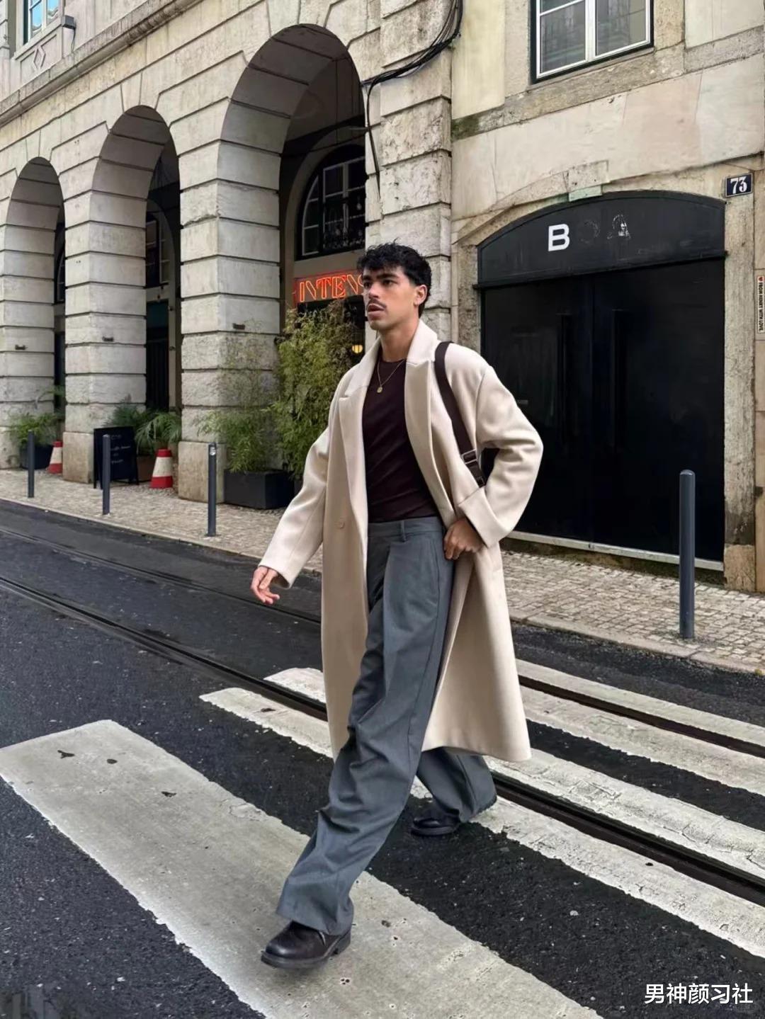 等到天气稍微回暖,薄一点的风衣就要登场了。这时,西装裤的选择标准只有一个:垂坠感。那种走起路来微微晃动、不留褶皱的面料,能瞬间拉长你的腿部线条。