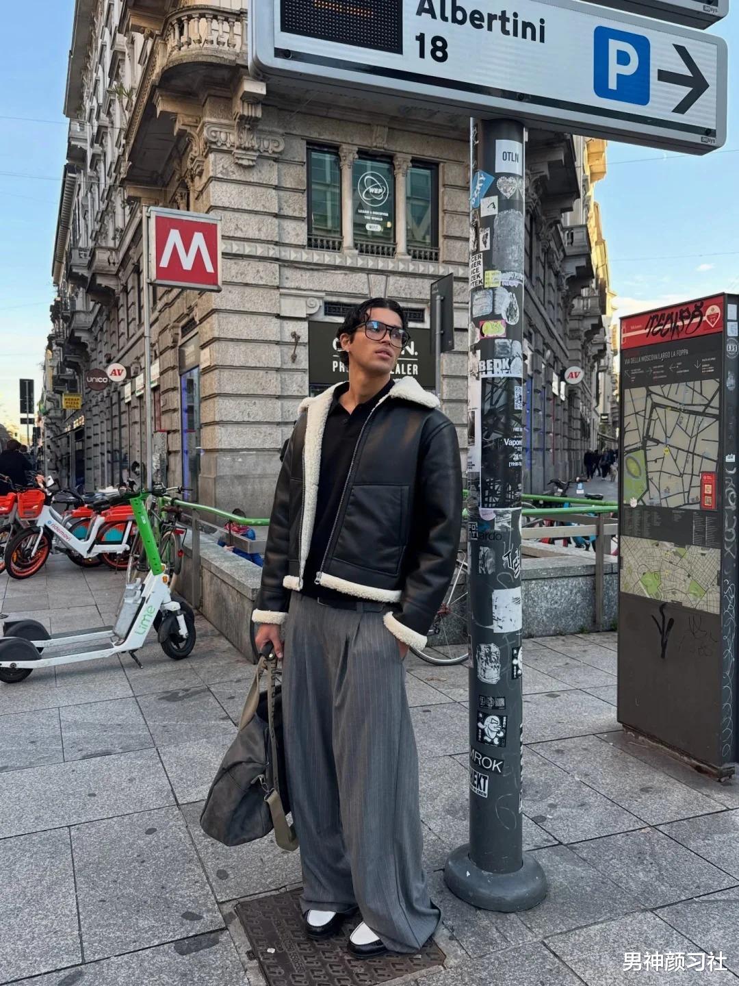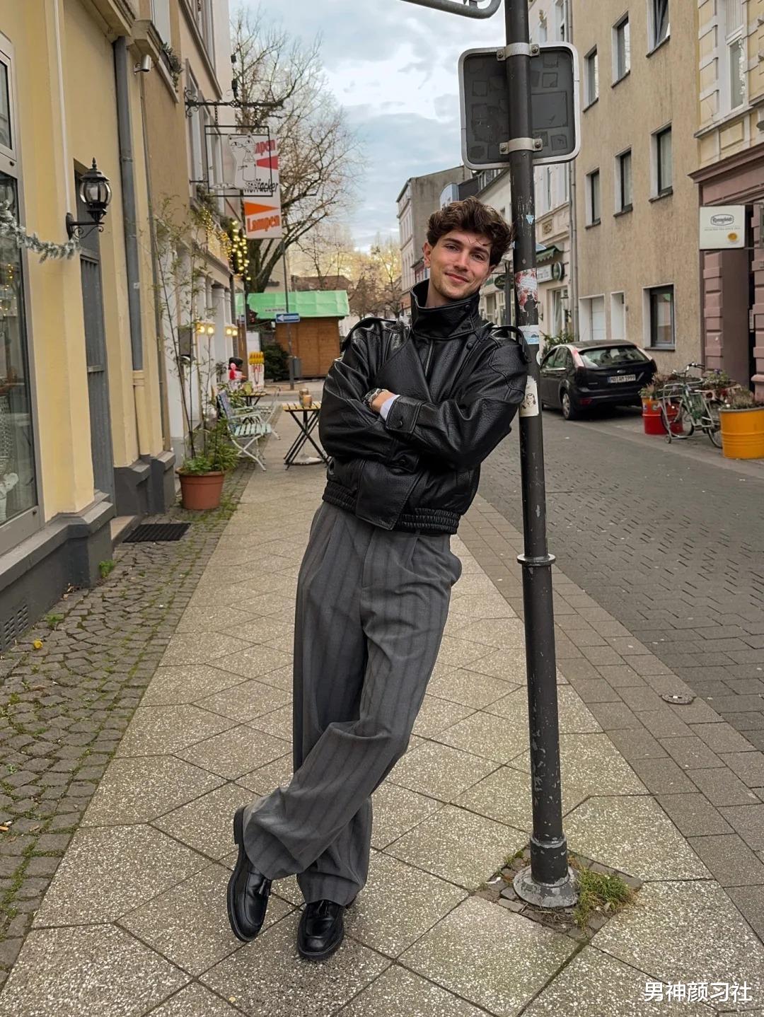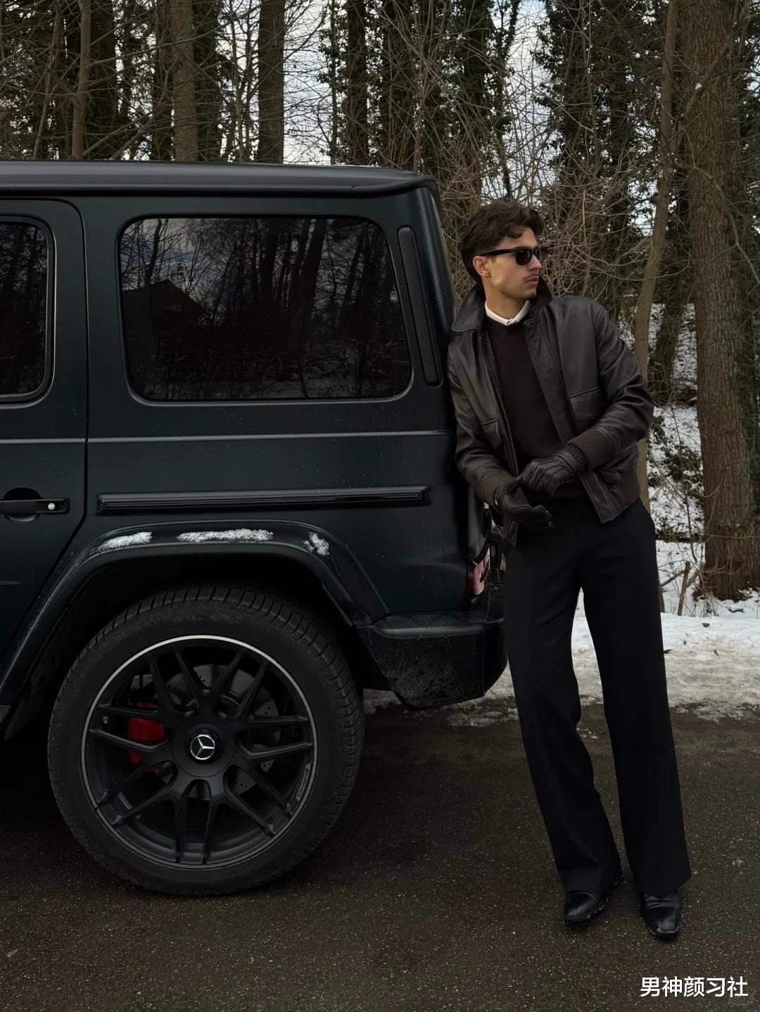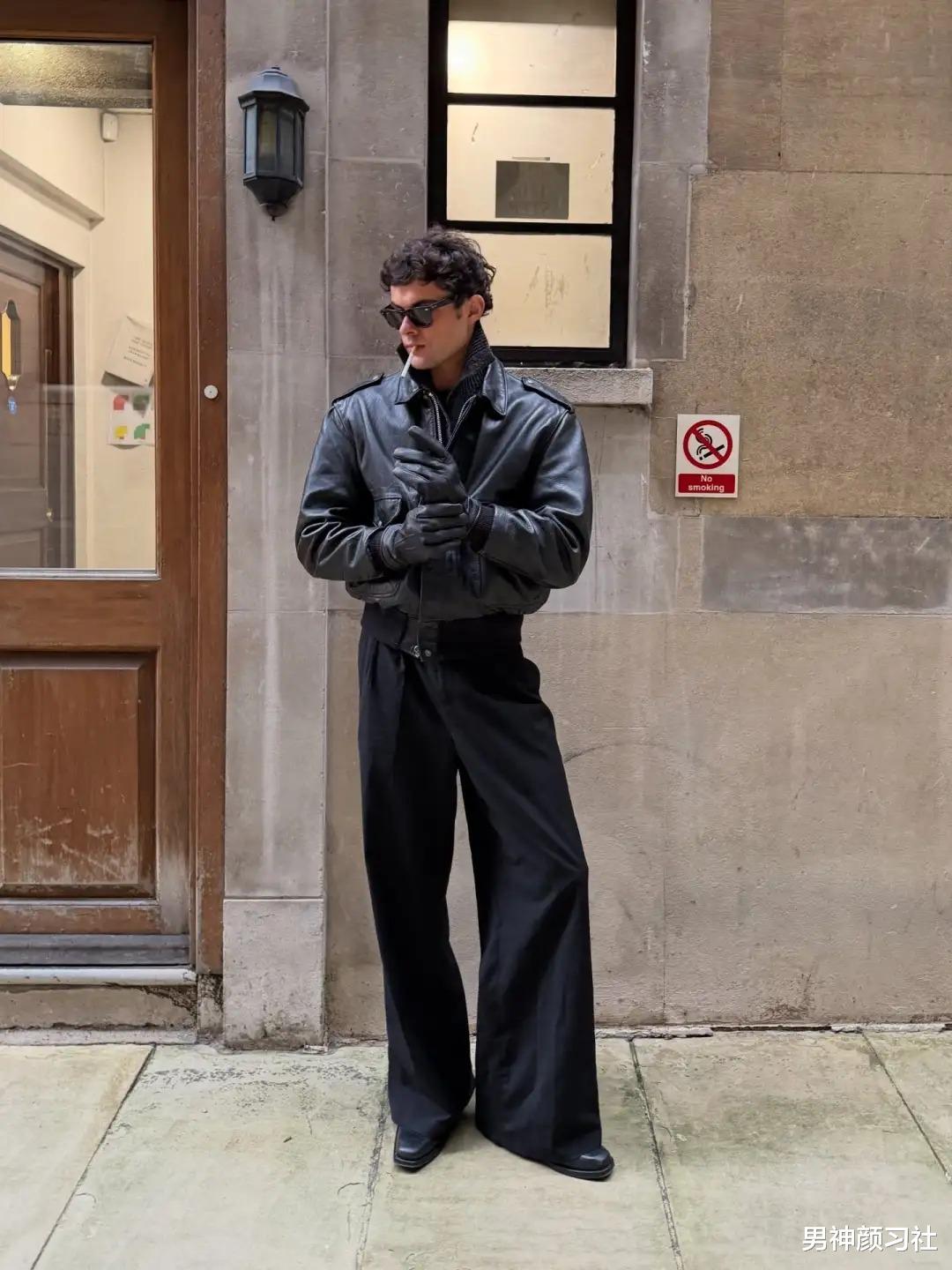 很多人觉得皮衣只能配破洞牛仔裤走摇滚风,其实皮衣 + 西装裤才是真正的“雅痞”天花板。在天气更冷的地方,选一件皮毛外套,下身配一条厚实的西装裤。这种上重下轻的视觉对比,能有效避免冬日臃肿。