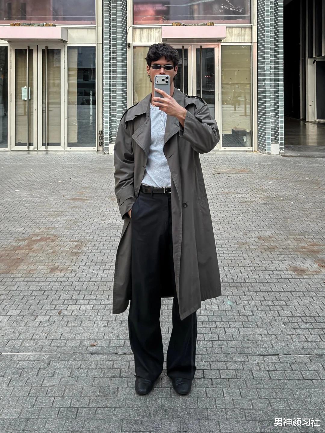 灰色风衣 + 浅灰色内搭 + 黑色西装裤这套搭配完全不挑身材,浅灰色的过渡让视觉重心上移,黑色的裤装负责收尾。无论是通勤还是约会,这套 Look 都能让你散发出一种受过良好教育的温润气质。
