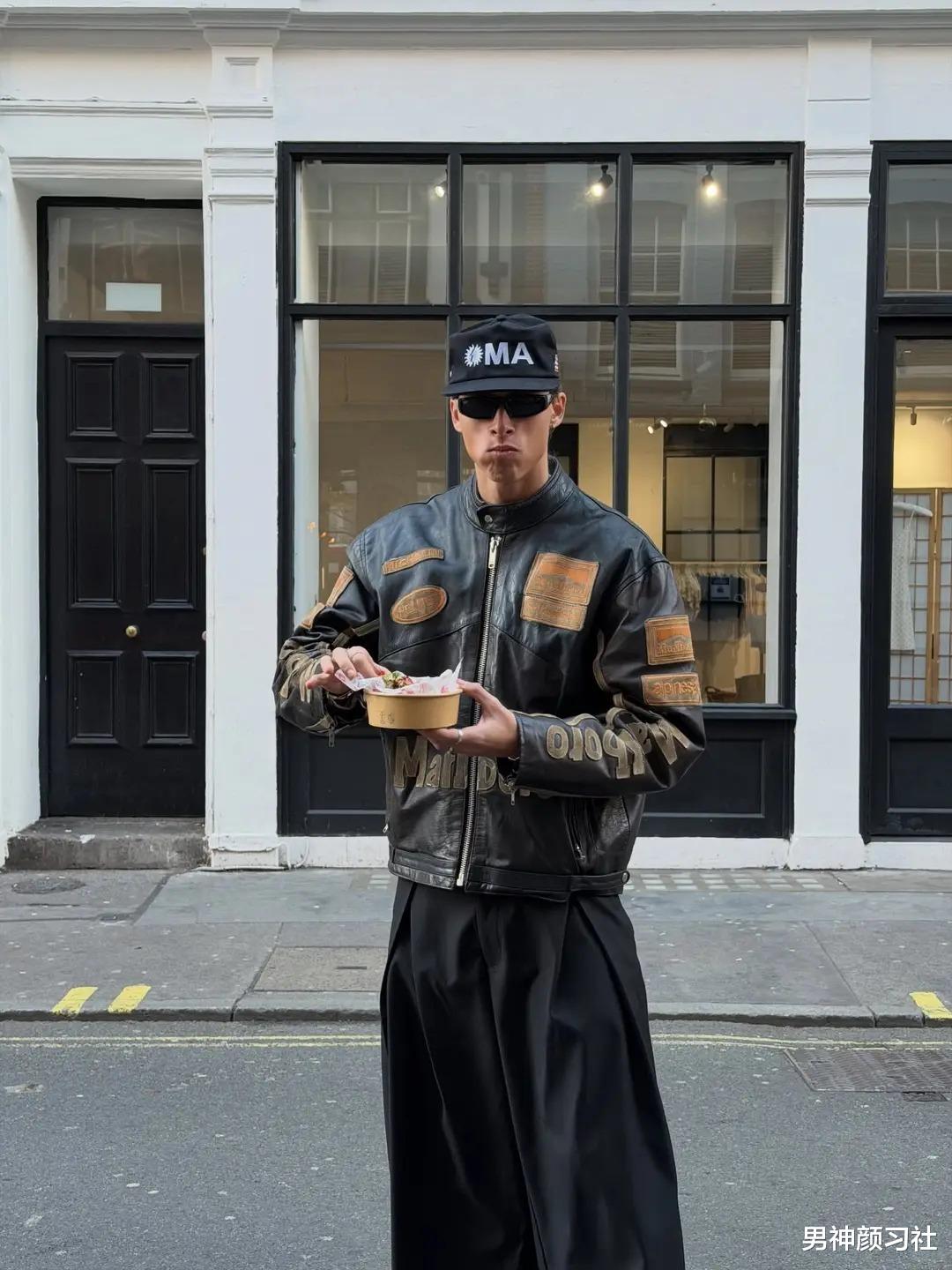 向欧美男生学习,用简单的短款皮衣搭配一条直筒西装裤,再扣上一顶有风格的棒球帽。这种混搭巧妙地打破了西装裤的沉闷,让整个人看起来既叛逆又精致。