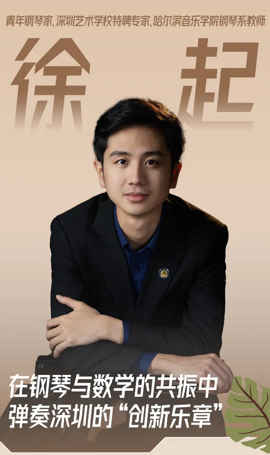徐起,青年钢琴家,深圳艺术学校特聘专家,哈尔滨音乐学院钢琴系教师,深圳市“鹏城优才卡”持卡人。在哥大/剑桥的数学系与茱莉亚的钢琴演奏专业之间,他完成了一次优雅的跨越。他曾斩获乌克兰克莱涅夫国际钢琴比赛第一名、德国艾特林根国际青年钢琴比赛第二名及摩洛哥国际钢琴比赛第一名等多项国际大奖。作为一名土生土长的深圳人,他怀揣特区“敢为人先”、“大鹏展翅”的精神,远赴祖国最需要的地方,投身黑龙江省的教育事业,并以独特的跨学科思维,探索音乐表演与教育的未来路径。