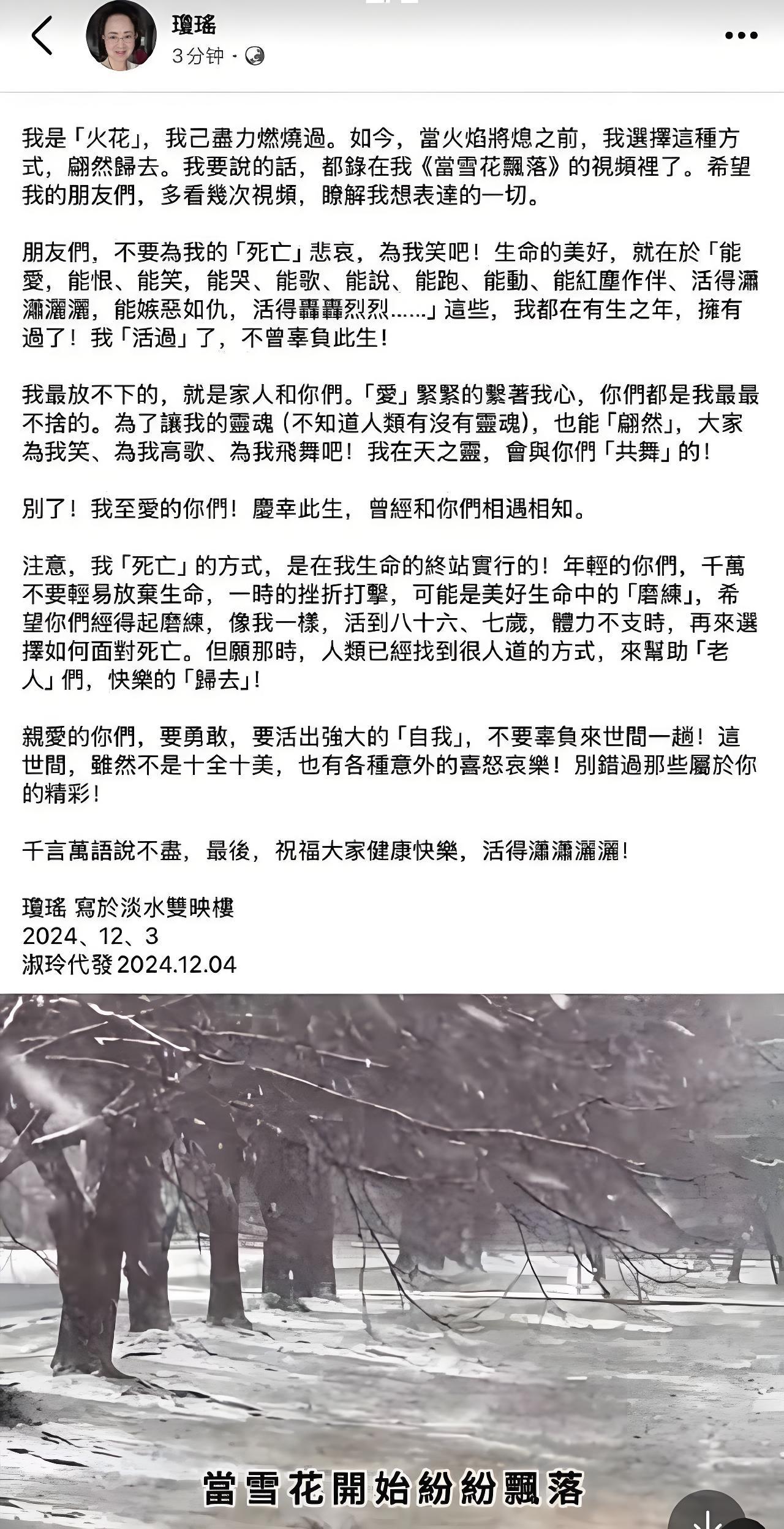 在她留下的遗书中,表达了对生命的理解和对死亡的淡然,并表示,不愿在年华老去的过程中失去自己的尊严,更不愿成为家人的负担。