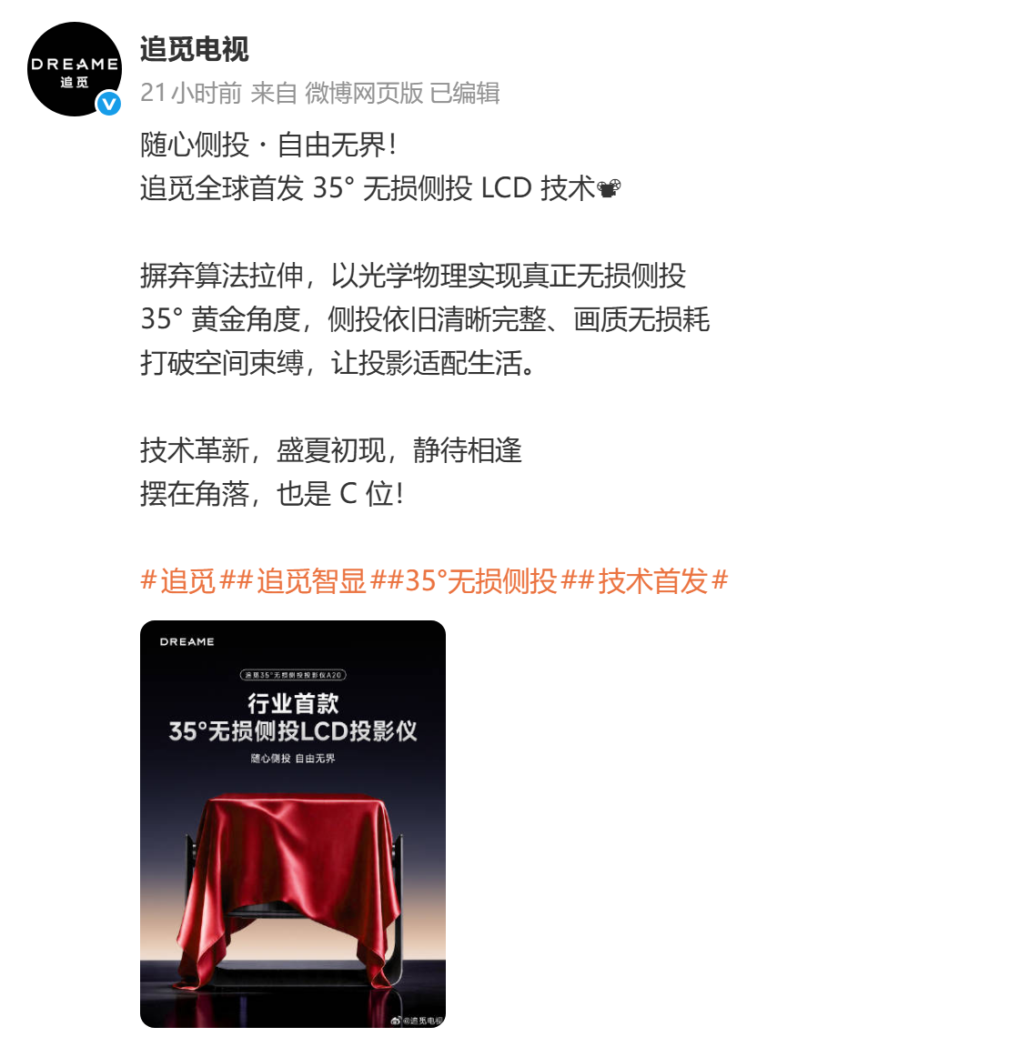 日前,追觅智显宣布推出全球首款支持35°无损侧投的LCD投影仪A20,针对投影产品长期以来“必须正中摆放”的使用痛点,给出新的技术路径。