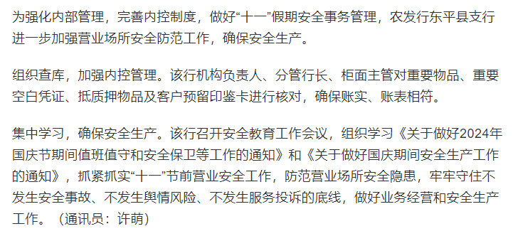 农发行东平县支行加强“十一”假期营业场所安全防范工作