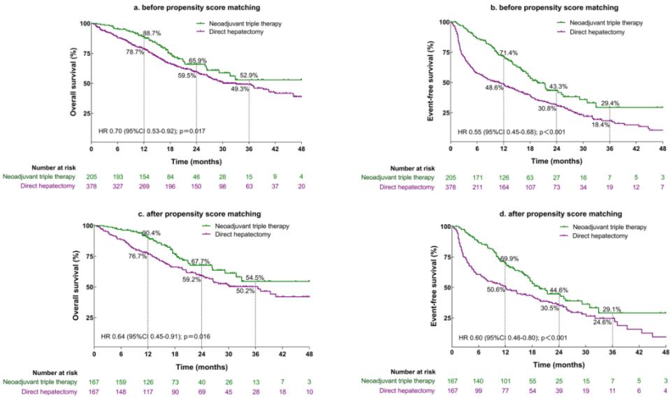 本研究回顾性比较了2019年至2023年间在中国20家医疗中心接受治疗、符合可切除标准并被分配接受新辅助三联疗法(n=205)或直接肝切除术(n=378)的583例患者的总生存期(OS)、无事件生存期(EFS)、不良事件和术后并发症。亚组分析包括106例接受新辅助三联疗法后行肝切除术的患者和99例接受该疗法但未后续手术的患者。