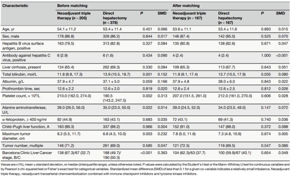 表1. 按初始治疗方式(肝切除 vs. 新辅助三联疗法)分层的患者基线特征(PSM前、后)