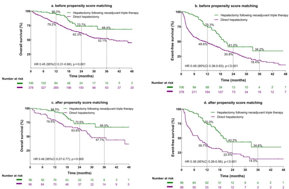 肝切除亚组:在接受肝切除的患者中,预先进行新辅助三联疗法者的OS(HR=0.45)和EFS(HR=0.49)均显著优于直接肝切除术者(图3)。PSM后结果一致。在BCLC C期患者中,新辅助三联疗法后手术同样显示出显著的OS和EFS获益。