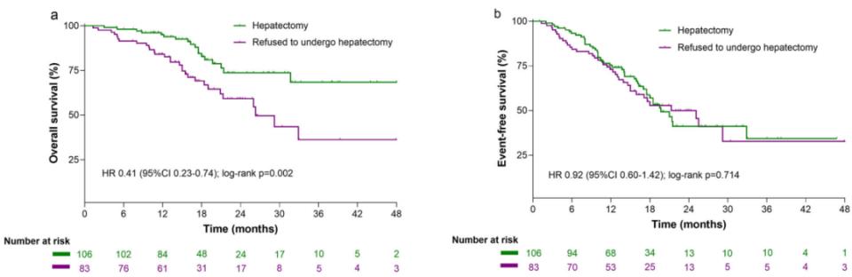 图4. 新辅助三联疗法后接受肝切除与拒绝肝切除患者的Kaplan-Meier生存曲线(排除16例因肿瘤进展失去手术机会的患者)