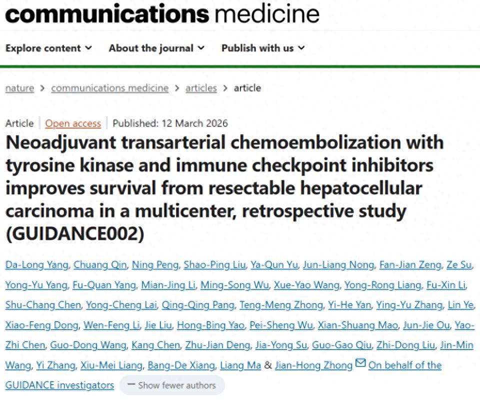 原文链接:Yang DL, Qin C, Peng N, et al. Neoadjuvant transarterial chemoembolization with tyrosine kinase and immune checkpoint inhibitors improves survival from resectable hepatocellular carcinoma in a multicenter, retrospective study (GUIDANCE002). Commun Med (Lond). 2026;6(1):139. Published 2026 Mar 12. doi:10.1038/s43856-025-01303-w