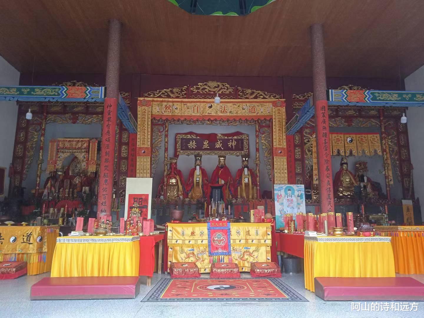 殿内正中,中间神位上面横批四字:神威显赫。上首书:道法自然。两侧分别书:道生一一生二二生三三生万物;
