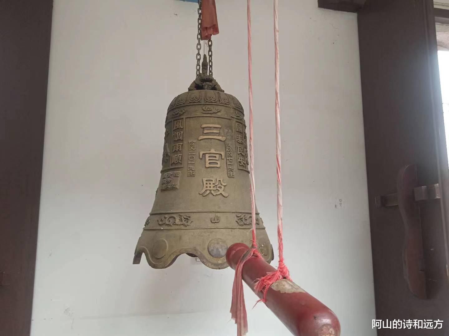 有一口钟挂在横梁上,钟上有镌刻着“三官殿”“国泰民安”“风调雨顺”“道历四七一六年”“公元二O一九年”等文字。