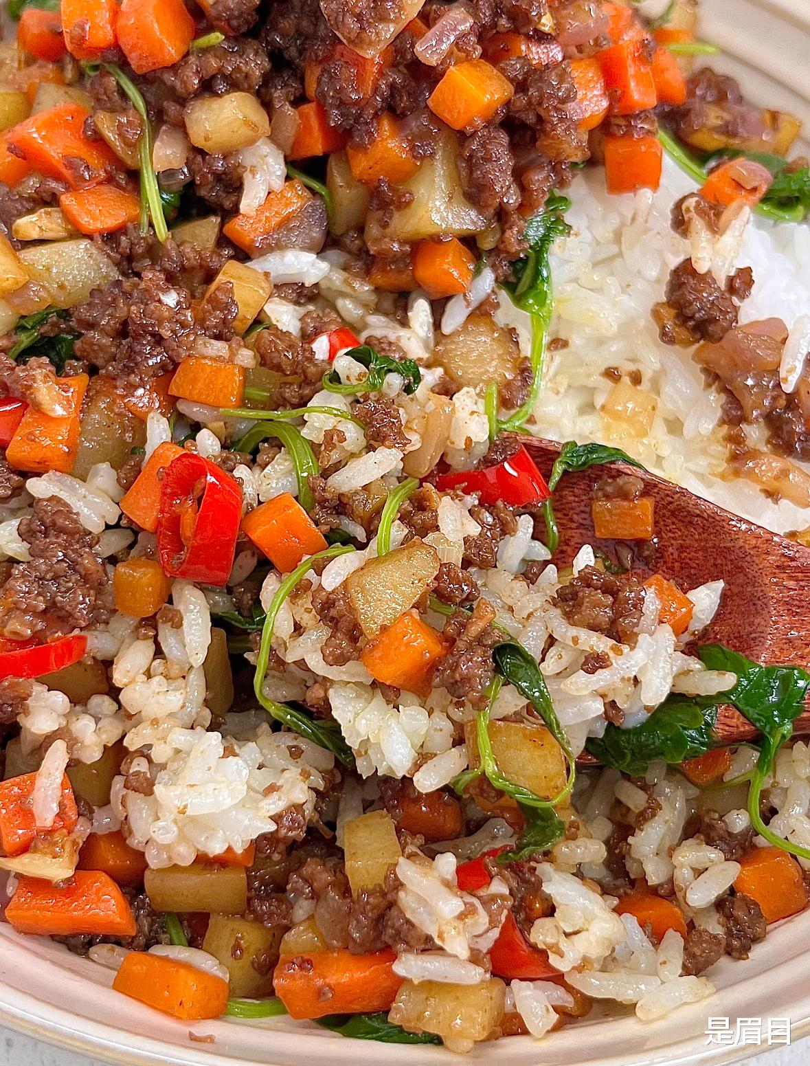 材料准备(2-3人份)牛肉末: 200-300克(可选择牛腿肉,性价比高且易入味)土豆: 1个(约150克)胡萝卜: 半根(约80克)洋葱: 半个(约100克)咖喱块: 2块(市售常见口味均可,如原味、辣味等)食用油: 1汤匙生抽: 1汤匙(用于提鲜)料酒: 1汤匙(用于去腥)蒜末、小米椒: 少许(可选,喜欢辣味可添加)椰浆或牛奶: 50毫升(可选,能让咖喱汁更香滑浓郁)黑胡椒粉、淀粉: 少许(用于腌制牛肉,使其更嫩滑)1. 将土豆和胡萝卜去皮,切成1厘米左右的小丁。切好后将土豆丁放入清水中浸泡片刻,可以防止氧化变黑并去除多余淀粉,使成品更清爽。洋葱切成小丁。如果使用整块牛肉自己剁馅,可以将牛肉切成小块后用剪刀或刀处理,比直接用刀剁更省力。(可选步骤)牛肉末中加入1汤匙料酒、少许黑胡椒粉和淀粉,抓匀后腌制15分钟,这样处理后的牛肉口感会更嫩滑。2.锅中倒入食用油,用中火加热。油微热后,先放入洋葱丁翻炒,直到洋葱变得透明并散发出香味。如果喜欢辣味,可以在这一步加入切碎的蒜末和小米椒一起爆香。 加入牛肉末,快速划炒,直到肉末均匀散开并颜色变白。接着放入土豆丁和胡萝卜丁,继续翻炒2分钟左右,让蔬菜表面均匀受热。3. 向锅中加入热水,水量大约要没过锅中的食材。盖上锅盖,转为中火焖煮约8-10分钟,直到土豆和胡萝卜变软熟透。期间可以留意一下水量,防止干锅。4. 暂时关火或转为最小火。这是关键的一步放入咖喱块,用锅铲轻轻搅拌,利用锅中的余温使其完全融化。咖喱块完全融化并和汤汁混合均匀后,再重新开小火。(可选步骤)倒入椰浆或牛奶,这能让咖喱汁的口感立刻变得非常香滑浓郁,层次更丰富。根据喜好,可以加入1汤匙生抽调味增鲜。最后用大火稍微收一下汁,直到咖喱呈现你喜欢的浓稠度即可。5.将热腾腾的白米饭盛入碗中,稍微压实,再倒扣在盘子上,形成圆润的造型。将煮好的咖喱碎牛肉均匀地浇在米饭旁边,让金色的酱汁缓缓渗入米粒中。选择带一些肥肉的牛腿肉馅,口感会比纯瘦肉更香更嫩,而且价格通常更实惠。关火后再放入咖喱块可以避免其因持续高温加热而结块或产生苦味。提前用少量牛奶或温水将咖喱块化开再倒入锅中,也是一个防止结块的好方法。在化开咖喱块时加入半勺蜂蜜或少许苹果泥,可以调和咖喱的涩味,增添一丝柔和的甜味,味道更有层次。吃剩的咖喱不要浪费,第二天加热时,打上一个鸡蛋一起焖熟,就变成了一份风味道地的日式咖喱蛋包饭。希望这份详细的菜谱能帮助你成功做出一碗让家人称赞的咖喱碎牛肉饭!祝你烹饪愉快!如果你对辣度或者配料有其他偏好,也可以随时调整,创造属于你自己的独特口味。
