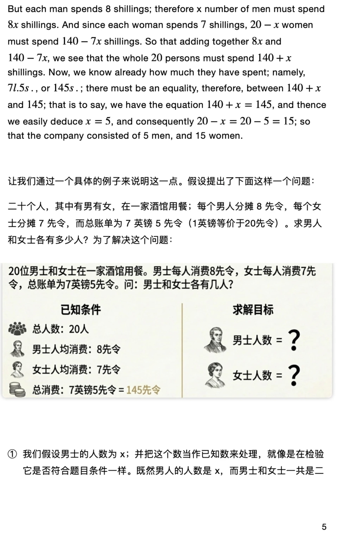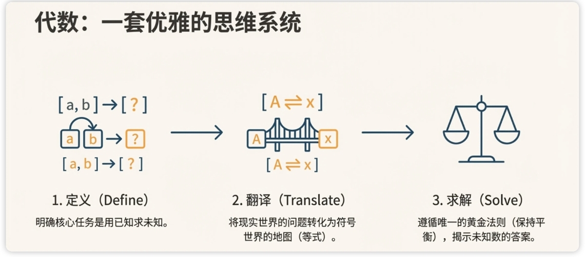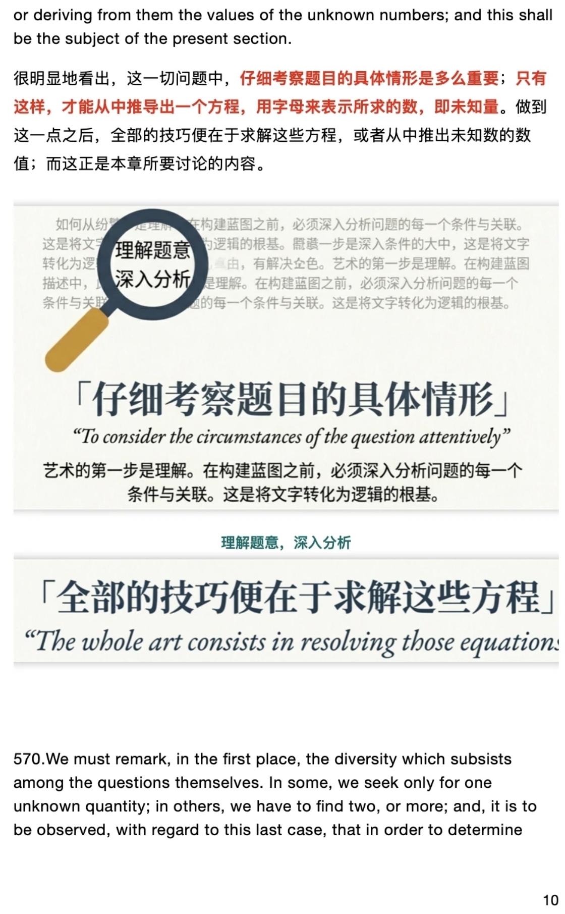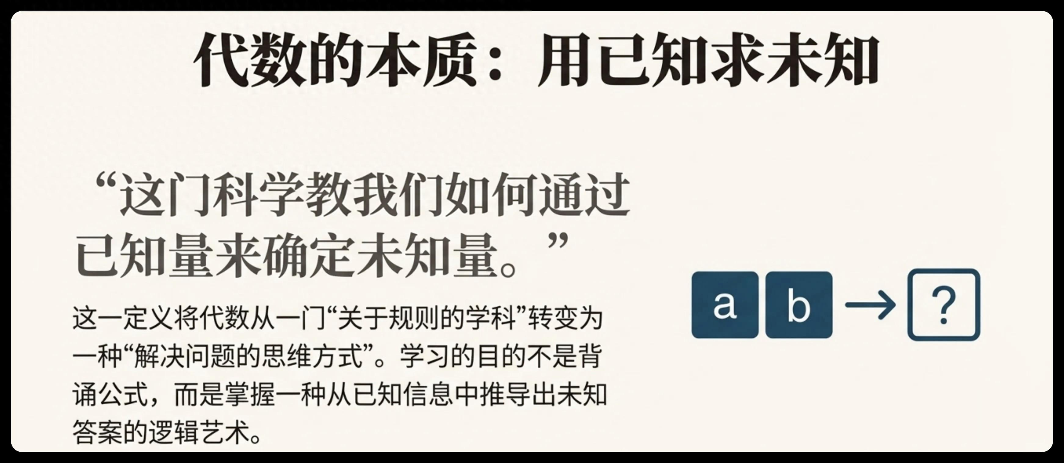 这门科学教我们如何通过已知量来确定未知量。 (The science which teaches how to determine unknown quantities by means of those that are known.),它将代数从一门“关于规则的学科“转变为一种“解决问题的思维方式”,学习代数的目的不是背诵公式,而是掌握一种从已知信息中推导出未知答案的逻辑艺术。