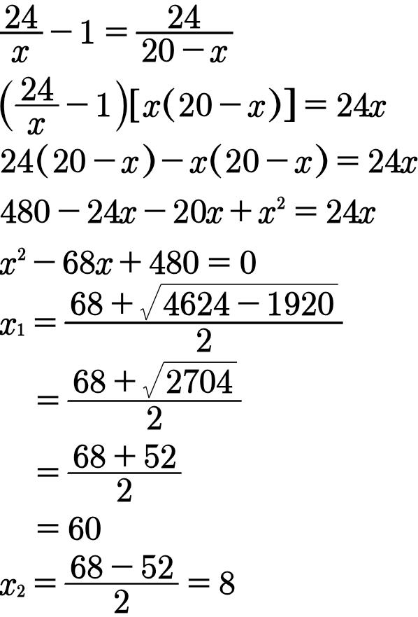 去分母后我们得到一个一元二次方程。运用求根公式我们得到两个根:x=60或x=8。