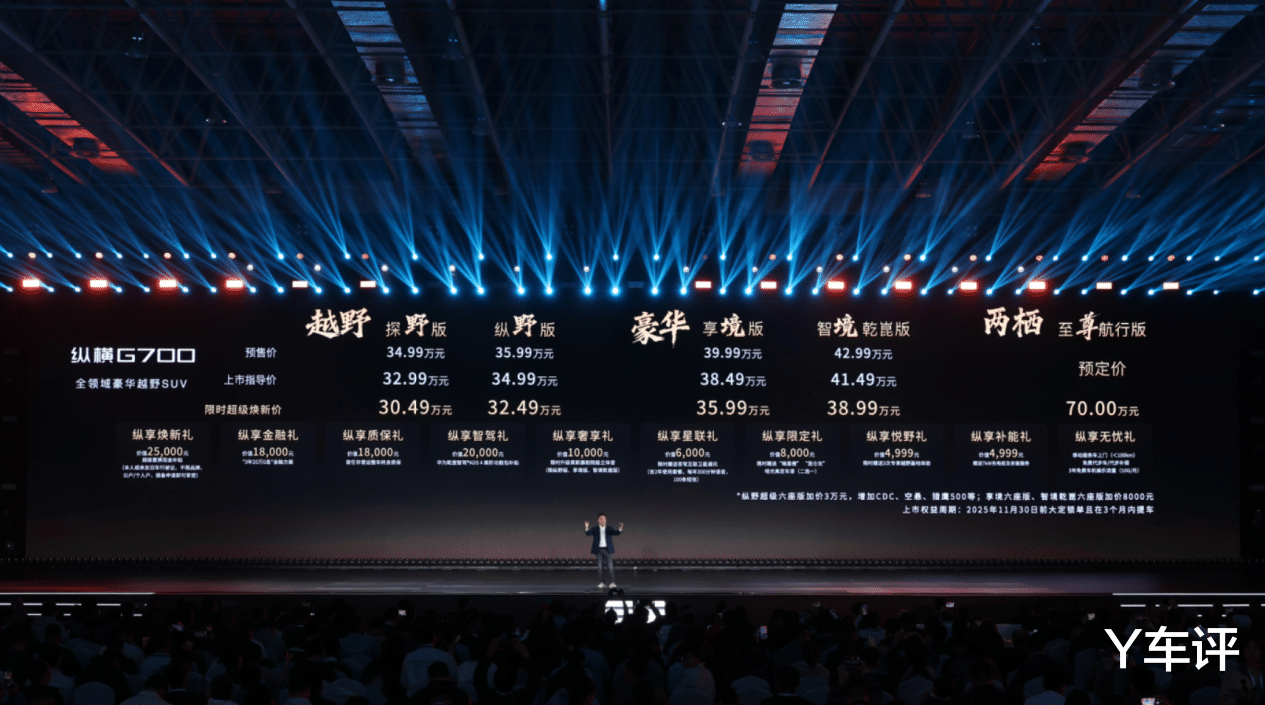 2025年10月19日,纵横品牌首款量产车型——G700在安徽芜湖宜居国际博览中心正式全球上市。新车定位“全领域豪华越野SUV”,推出探野版、纵野版、享境版、探境乾崑版及至尊航行版共5个版型,官方指导价32.99万元至70万元,限时超级焕新价30.49万元起。纵横G700以32.99万元的起售价直面向豪华级越野市场,并推出限时多重购车权益,显著降低用户拥车成本。