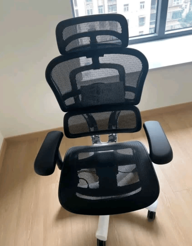 坐垫和靠背采用U型弹力网布,弹性适中,不软不硬,长时间坐不会觉得勒大腿,也不会闷。椅背支持5档升降,腰靠还能做4档调节,对于不同身高的人来说适配度挺高。扶手能360°旋转,用起来比较顺手,打字、休息或需要侧向支撑时都能方便调整。骨架是16kg的合金材质,重量比普通办公椅明显更沉,所以坐上去的稳定性很好。脚架是铝合金的,承重能力强,长期使用不会松动。唯一的小缺点是椅子整体比较重,移动时要费点力,尤其是地面不是很光滑的时候会更明显。