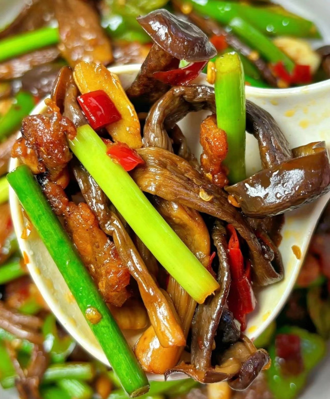 鹿茸菇炒五花肉,一经上桌,便成了餐桌上最耀眼的明星。那肉片与蘑菇的组合,宛如艺术品般精致,入口即化,满口留香。而它的存在,就像是对米饭宣战一般,每一粒米都变得无比珍贵,因为它们都将被这道菜的美味所征服。