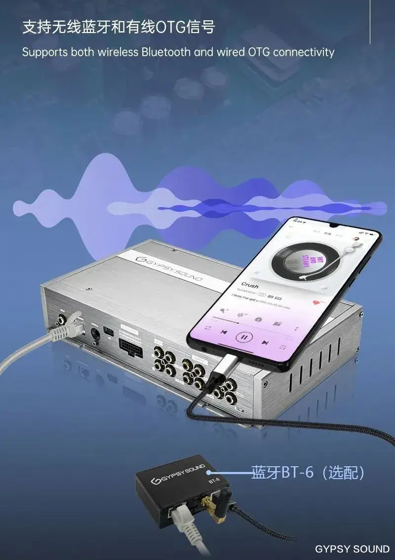 作为整套系统的“声音源头”,吉普赛之声OTG BT-6蓝牙,以简洁设计承载强大内核,深受初、中级音乐爱好者青睐。它支持高品质蓝牙音频传输,摆脱原车蓝牙的劣质音质,让驾驶者行车中可轻松连接手机,畅享海量曲库;OTG功能更能满足音质追求者的进阶需求,通过专用OTG线连接手机,音质表现更上一层楼,为整套音响系统筑牢坚实的音质基础。