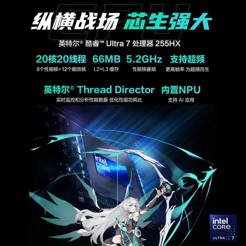 亮点速览: 华硕天选6 Pro酷睿版机型是为追求极致平衡的用户量身打造的全能战士,它搭载的英特尔酷睿Ultra 7 255HX处理器,拥有20核20线程的恐怖规格和高达5.2GHz的睿频,而且在新的 Arrow Lake 平台加持下,带来了能耗比的大幅度进步,无论是高强度电竞还是复杂的创意剪辑,都能轻松拿捏。配合满血115W功耗释放的 RTX 5060 显卡,辅以DLSS 4技术,3A大作的光影世界尽在掌握,配合冰川散热系统和双叶轮绝尘风扇,持续的高能输出依旧冷静如初。