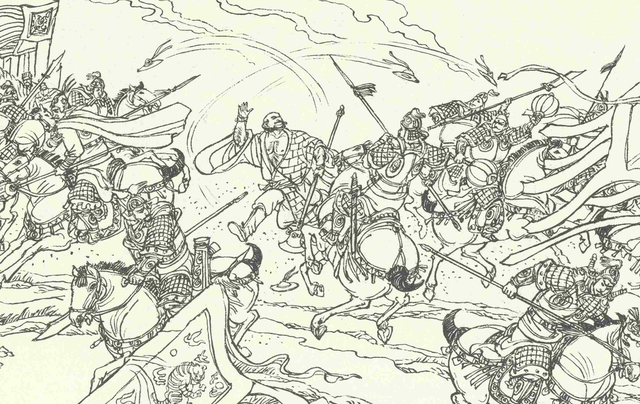 尉迟恭冲入敌阵,正遇李子通,战不到十合,尉迟恭一枪刺去,正中李子通咽喉,落马而亡。