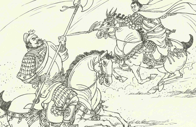 刘武周见程咬金劈了王龙,不禁勃然大怒道:“好你一个卖柴扒的山野匹夫,竟敢杀我大将!”催马冲出本阵,持大刀纵马杀奔程咬金而来。