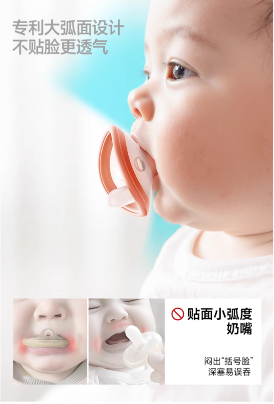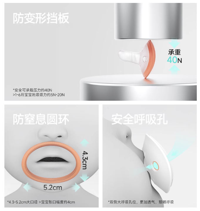 防窒息圆环:4.3-5.2cm大口径>宝宝张口幅度约为4cm