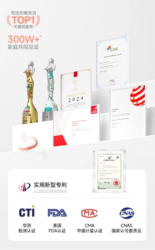 佳尔优优安抚奶嘴在天猫安抚奶嘴类目销量榜TOP1,其食品级硅胶材质与仿母乳、仿拇指设计成为差异化优势。
