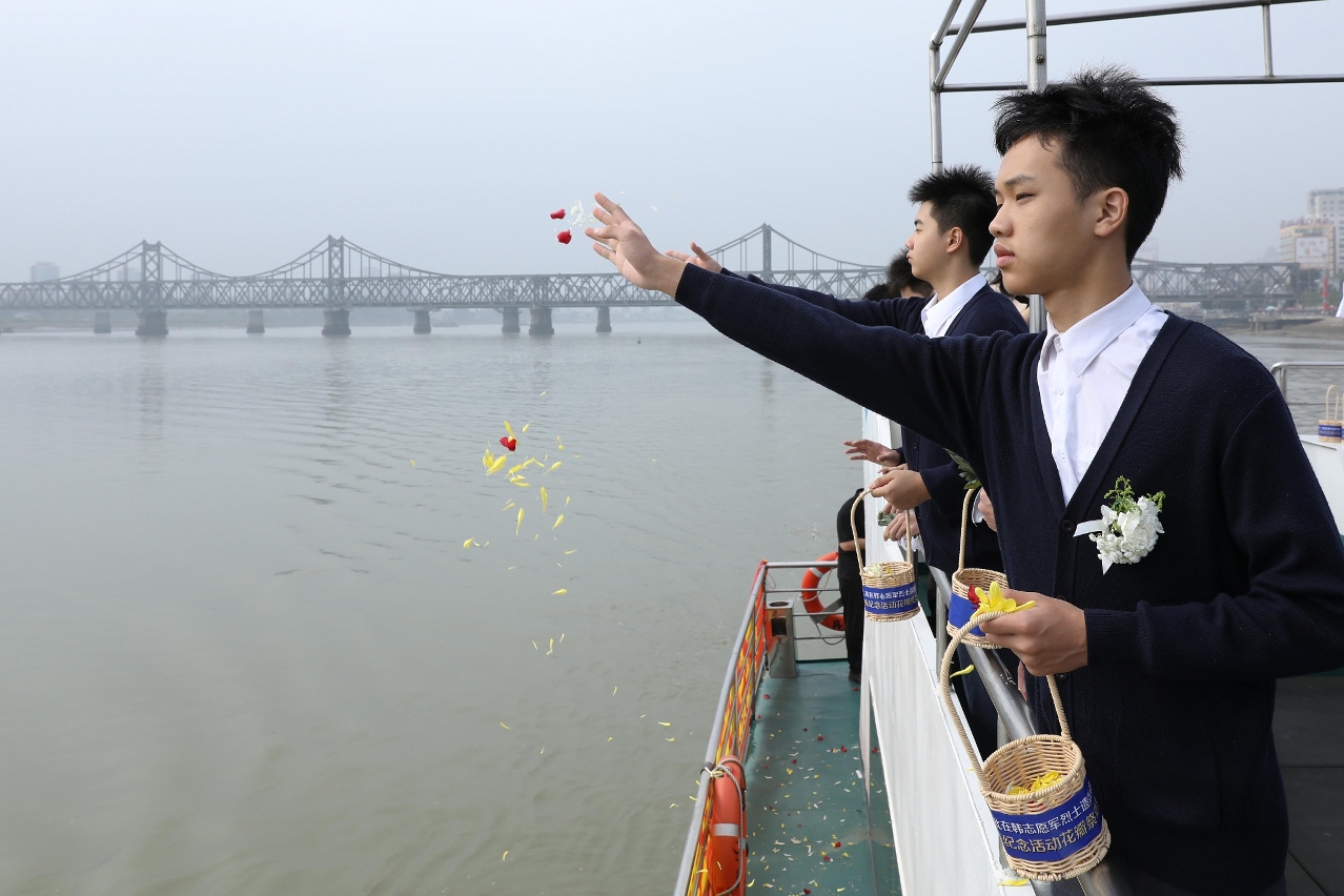翌日,前往辽宁丹东,参与在鸭绿江“归航号”纪念船上举行的第十二批在韩中国人民志愿军烈士遗骸归国安葬丹东市纪念活动花瓣祭奠仪式,播撒花瓣寄托哀思及对英烈致崇高敬意。并参观了鸭绿江断桥,向英雄群像敬献鲜花。