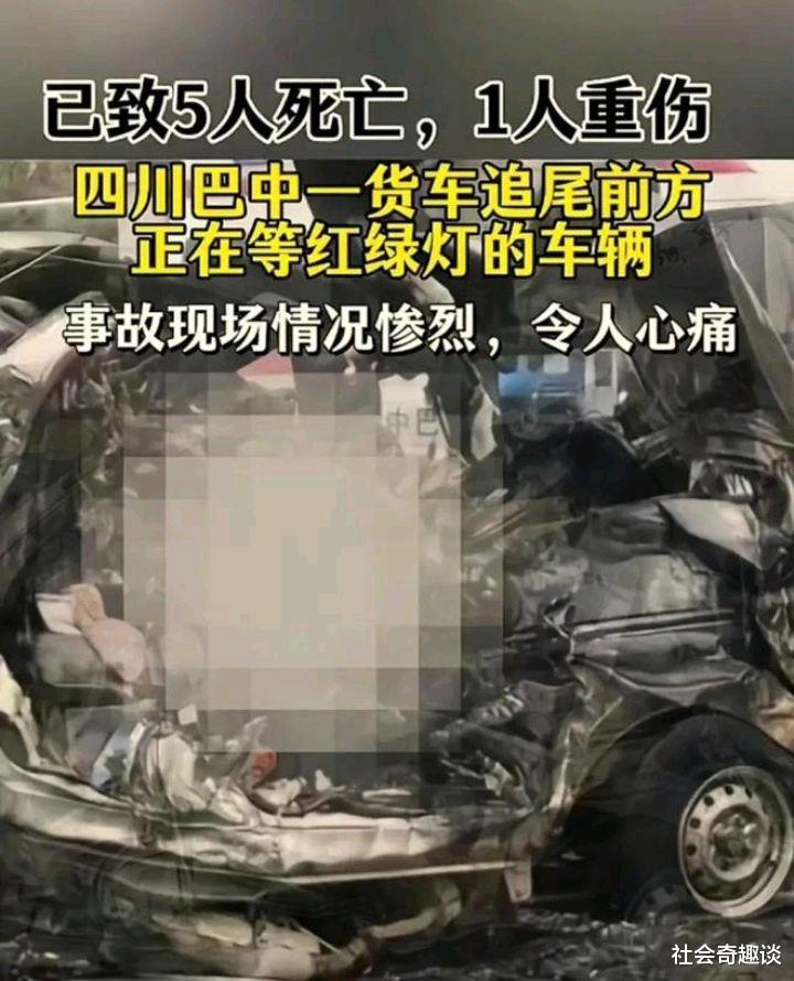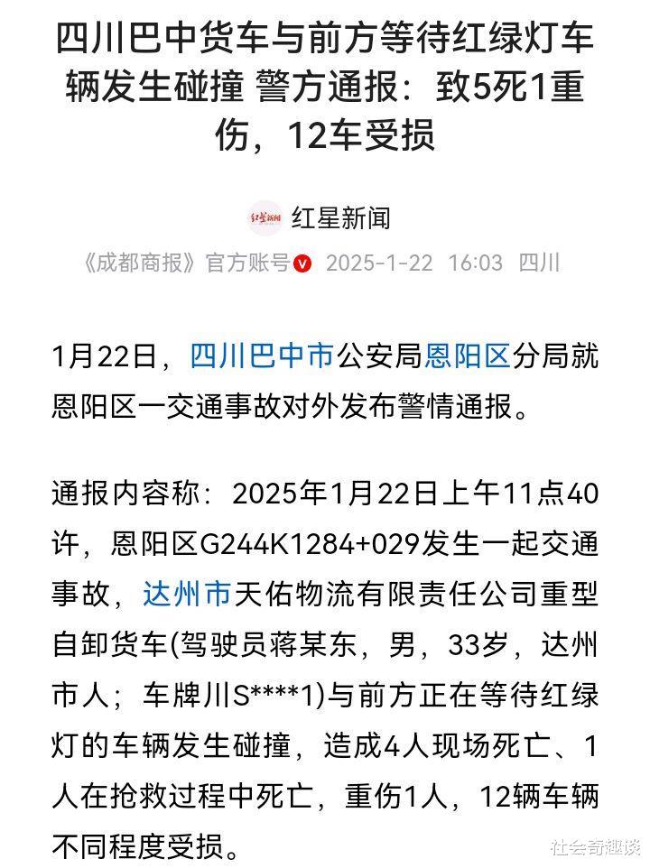 据1月22日四川巴中市公安局恩阳区分局通报,2025年1月22日上午11点40许,恩阳区G244K1284+029发生一起交通事故,达州市天佑物流有限责任公司重型自卸货车(驾驶员蒋某东,男,33岁,达州市人;车牌川S****1)与前方正在等待红绿灯的车辆发生碰撞,造成4人现场死亡、1人在抢救过程中死亡,重伤1人,12辆车辆不同程度受损。