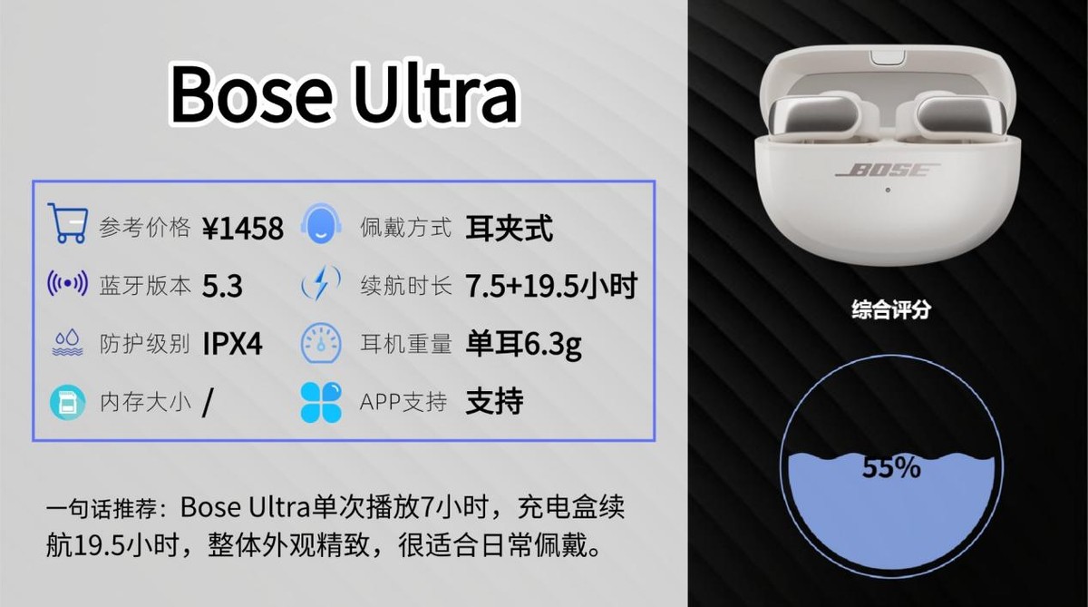 Bose在耳机市场以高品质音质和舒适佩戴闻名,运动耳机经验相对有限,更偏向日常聆听和办公场景。Bose Ultra在品牌中定位为轻量日用耳机,兼顾便携与音质体验。