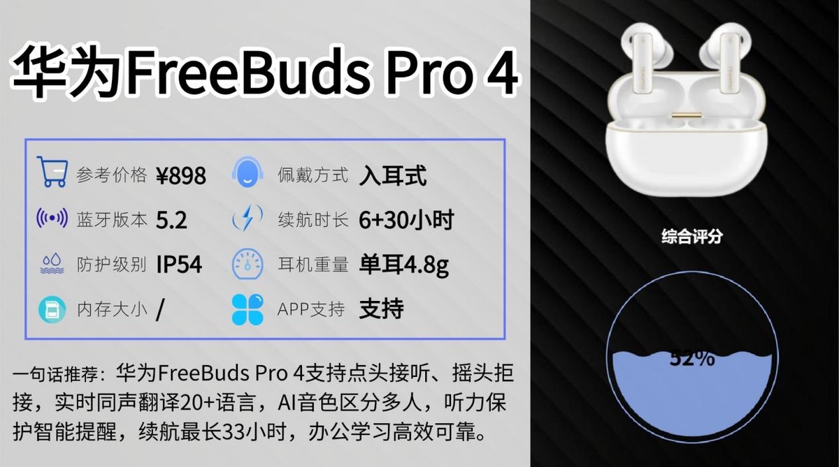 整体来看,华为FreeBuds Pro 4以智能翻译、头部动作操控和舒适佩戴为亮点,更适合办公、通勤及跨国交流场景,对运动需求则偏向轻量和基础使用。
