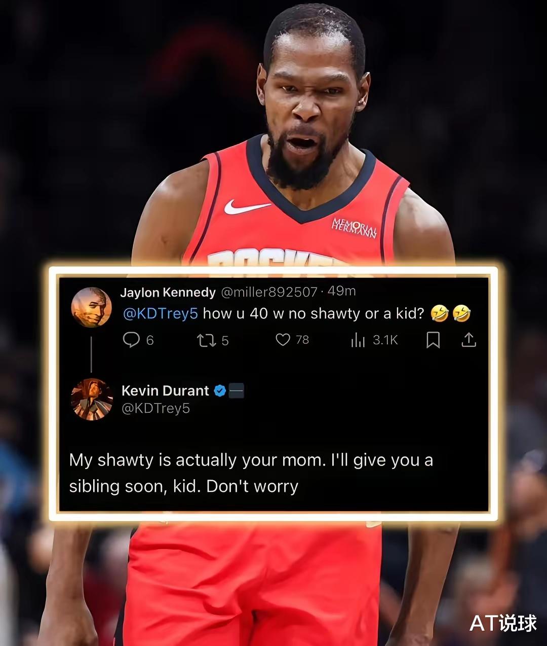 詹姆斯的大儿子布朗尼都已经进入NBA两年了,眼瞅着都快给詹姆斯生孙子了,库里更是都有四个孩子了。连自己当年在雷霆的好搭档哈登也偷摸生了一个六岁大的儿子,如今也快和女友走进了婚姻殿堂,只有杜兰特到现在还是单身一个人。球迷也是在社交媒体上嘲讽杜兰特快40岁了都还没女友,结果这可是撞上了杜兰特的强项,立马就开始在社媒对线。