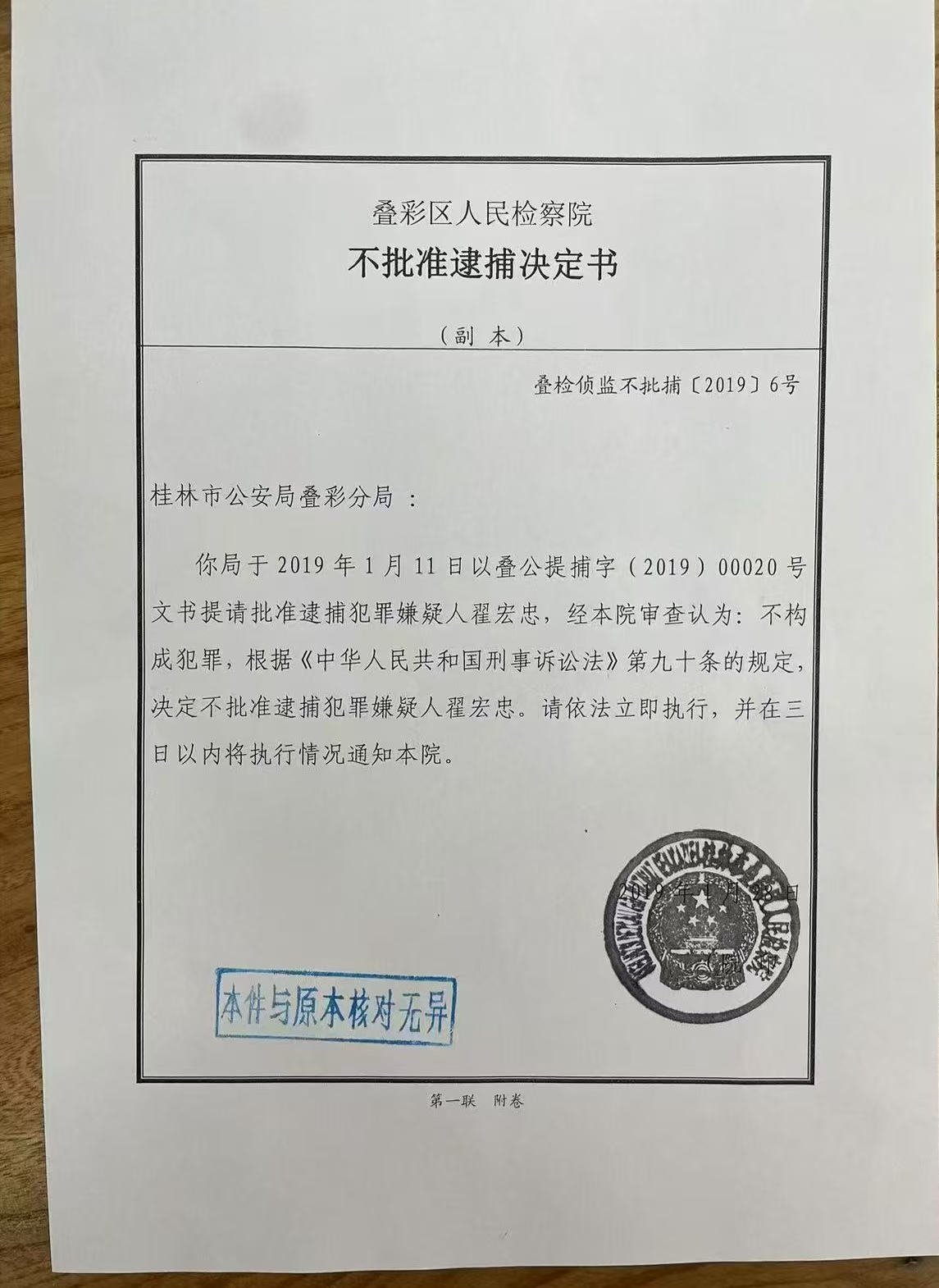 2019年1月11日,叠彩公安分局再次提请批准逮捕犯罪嫌疑人翟宏忠,但叠彩区检察院再次以“本案事实不清,证据不足”为由,不批准逮捕。