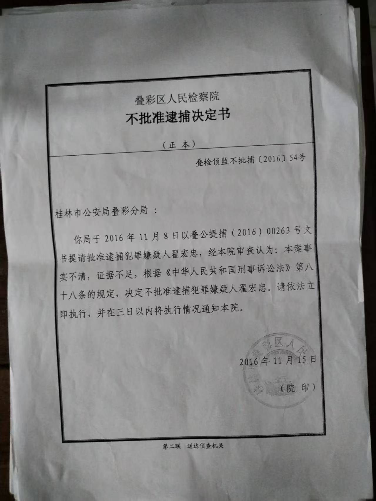 2016年12月15日,检察院却以“本案事实不清,证据不足”为由,不批准逮捕。