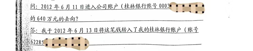 2012年6月11日,公司账户收到叠彩区政府土地补偿款640万元。两天后,翟宏忠将这笔钱转入了他的桂林银行私人账户。