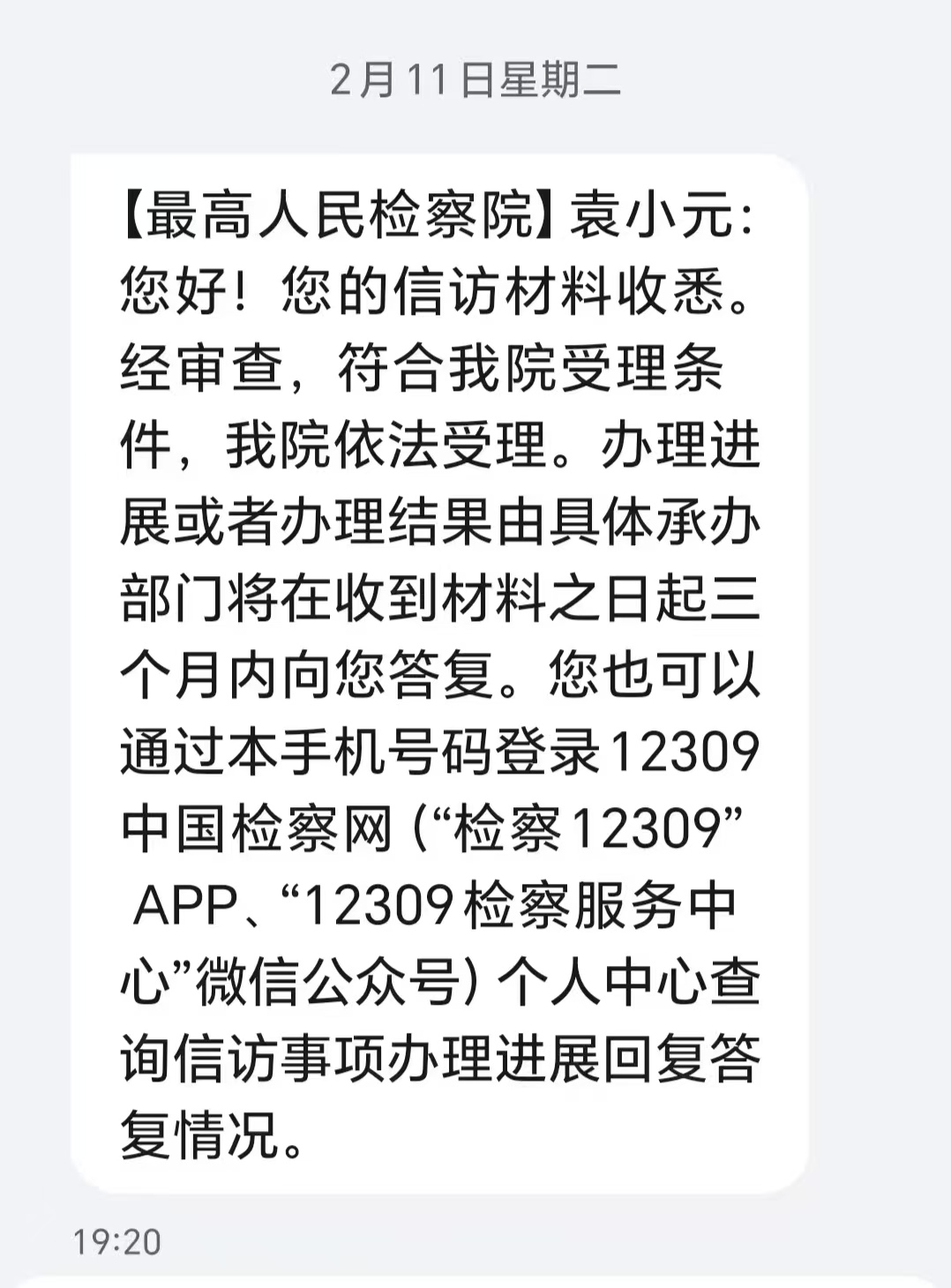 今年1月8日,袁小元向全国最高人民检察院提交了刑事申诉书。2月11日,最高检回复:经审查,符合我院受理条件,我院依法受理。