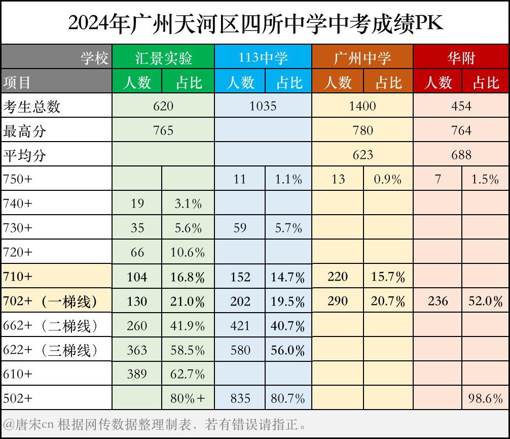 查看去年的一梯线,不难发现:汇景(21%)>广中(20.7%)>113中(19.5%)。由于去年也没拿到天河中学的中考成绩,所以比较难判断出天中的具体座次。但是有一点可以肯定,这四所学校的实力比较接近,而且都很强。