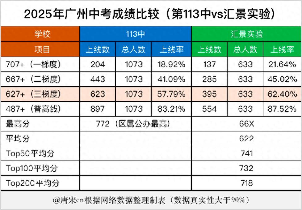 2025年第113中学和汇景实验学校的考生数量分别为1078和633,由于113中的人数多一些,所以每个分数段上的人自然会多一些。所以我们在这里比较的是上线率。以下数据的比较中,前者为113中,后者为汇景实验学校。