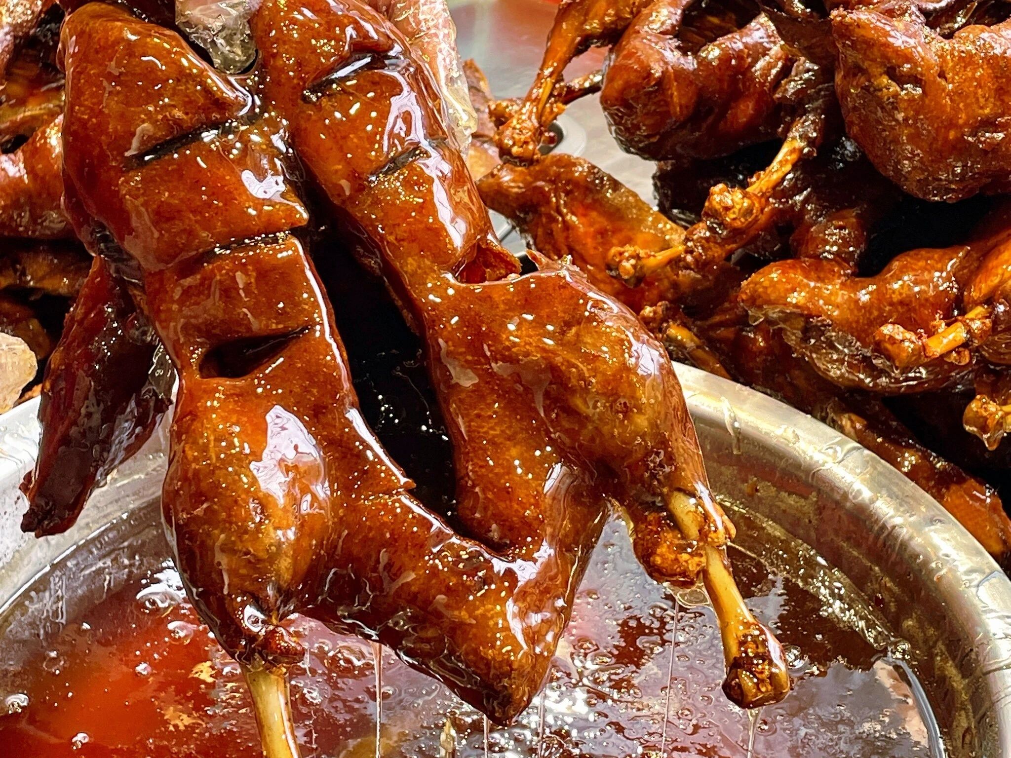 打破了人们对于川菜只有麻辣口味的固有看法,乐山甜皮鸭以其独特的制作工艺——先卤制后油炸,最后涂上饴糖,呈现出外皮酥脆、甜香四溢,内里肉质嫩滑、鲜美多汁的特点。其咸甜相间的风味,不仅令人回味无穷,而且即便是骨头也让人忍不住想要细细品味。